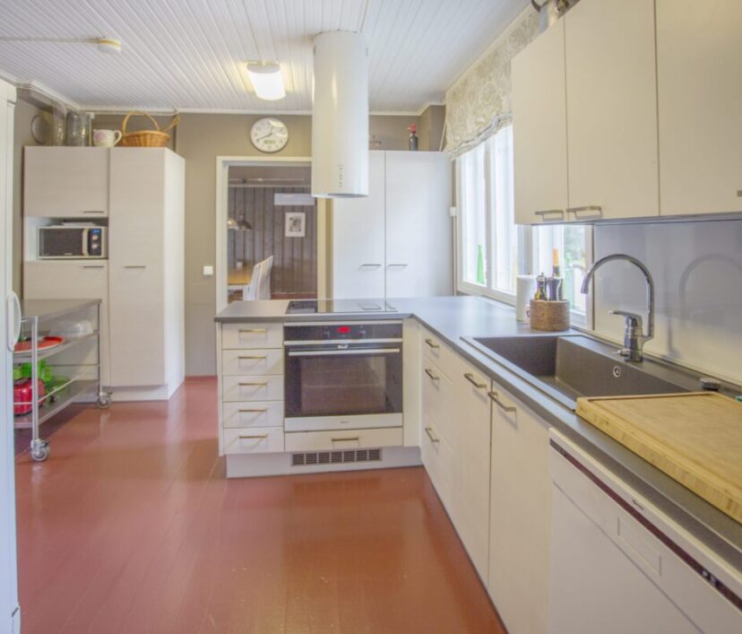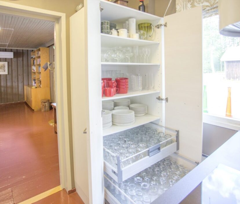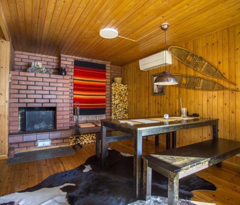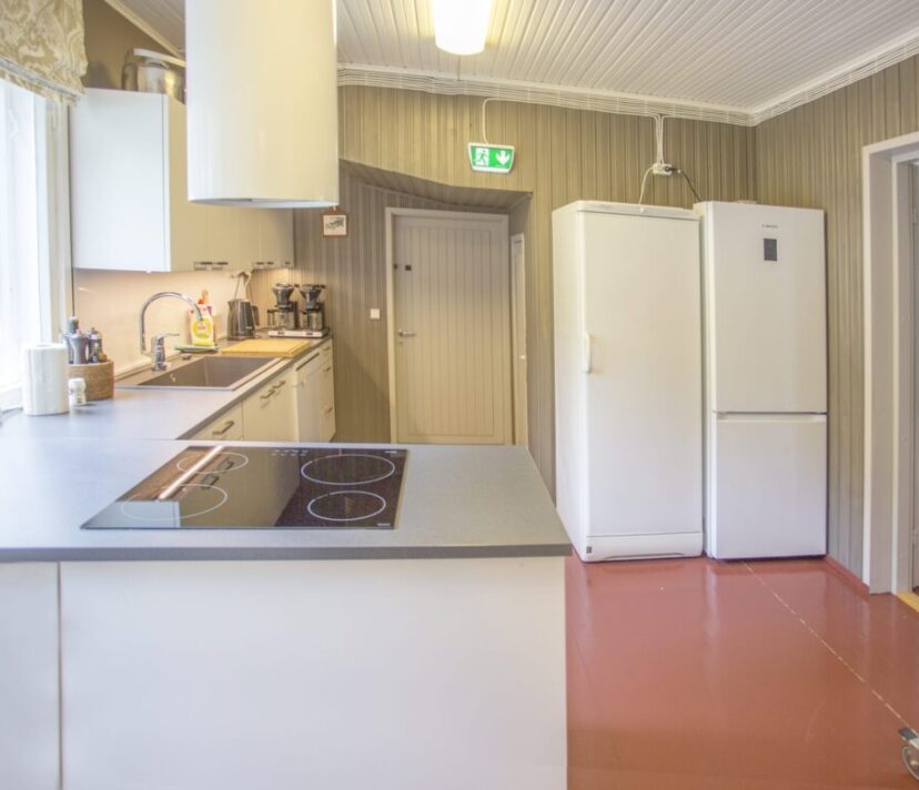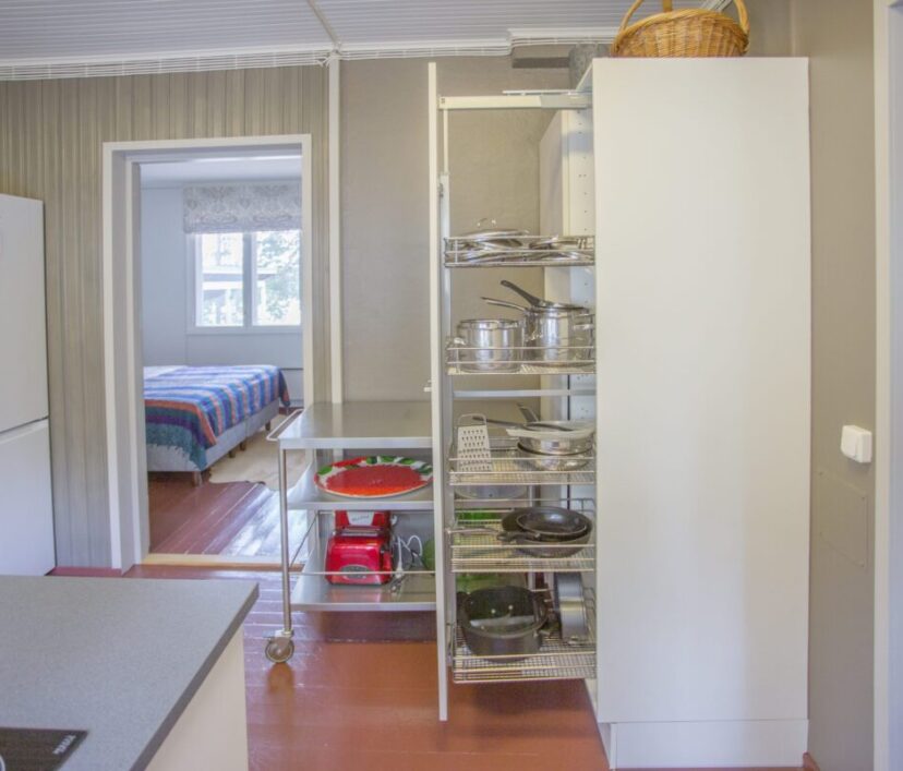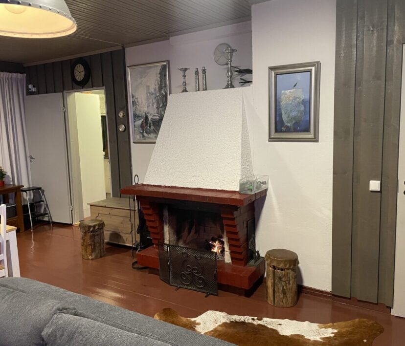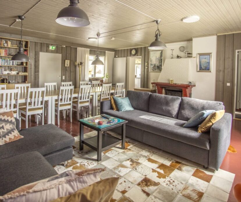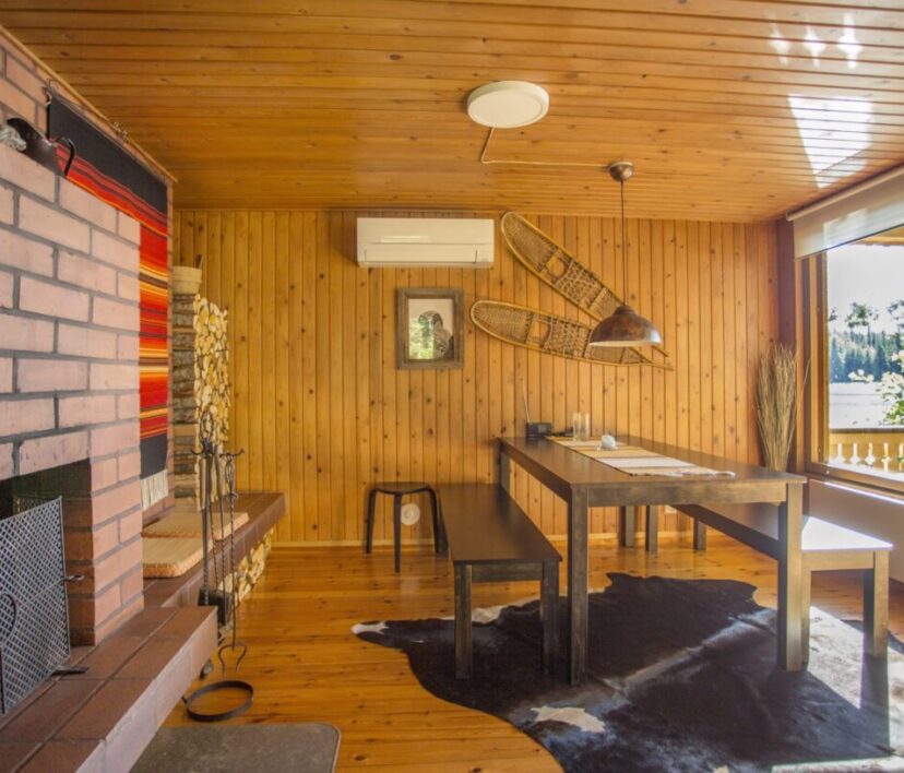 Ruokailupöydät ja tuolit 15 henkilölle, olohuonenurkkaus jossa kaksi vuodesohvaa, avotakka ja tv. Kirjahyllyssä paljon kirjoja ja erilaisia lautapelejä. Hyvin varusteltu keittiö jossa tarpeelliset astiat ja ruuanvalmistusvälineet, kaksi jääkaappia ja pakastin. lisäksi yksi tilava makuuhuone jossa kakluuni-uuni.