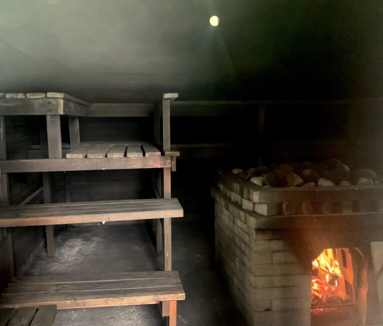 Tällaisesta pääsee harvoin kokemaan. Iso löylyhuone ja vilvoitteluterassi. Suihkut viereisessä rantasaunassa. Lämmittämiseen kuluu 4-5 tuntia ja lämmitetään vain isännän toimesta erikseen tilattuna.