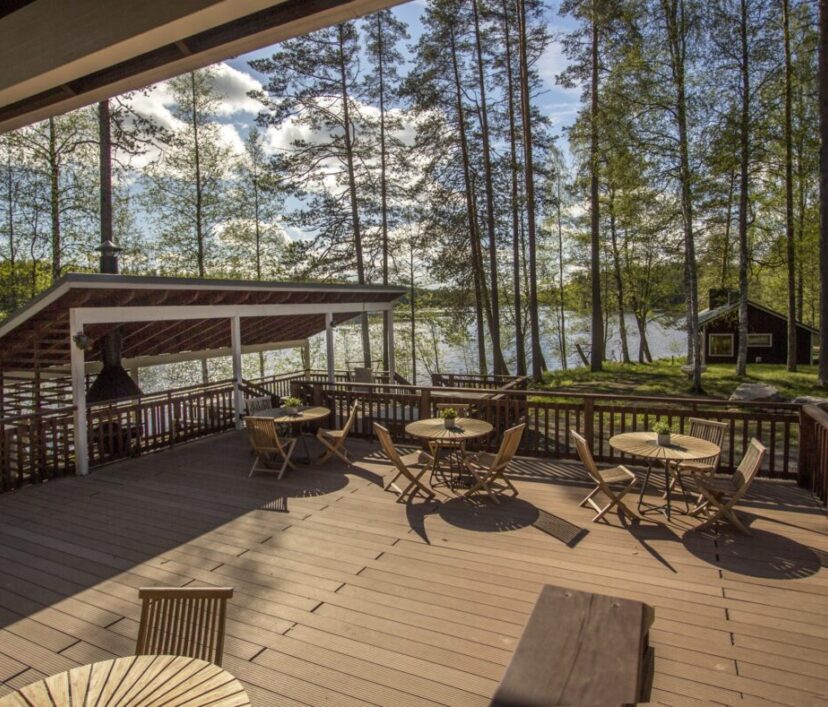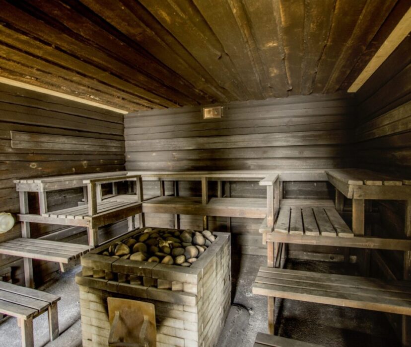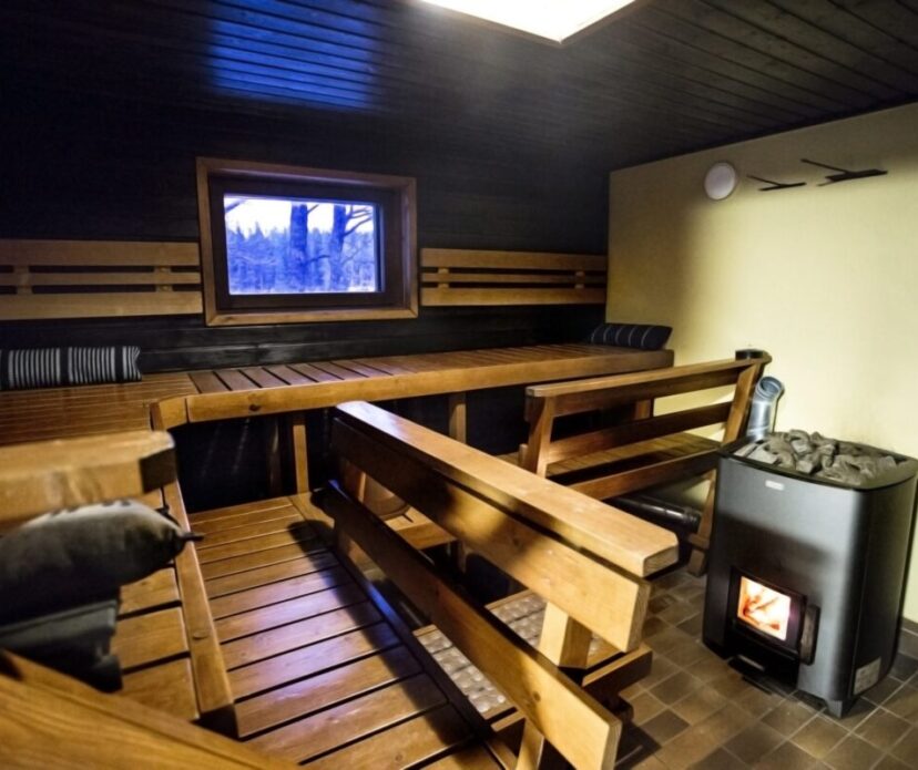 Kaikki tarvittava perinteiseen saunomiseen ja järvenranta tunnelmasta nauttimiseen. Iso löylyhuone puukiukaalla, pesuhuone jossa kaksi suihkua, kaksi pukuhuonetta, kaksi wc-huonetta, takkahuone ja vilvoitteluterassi josta suora yhteys rantaterassille ja uimalaiturille.
