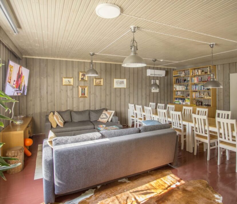 Yläkerrassa yksi iso huone jossa sohvaryhmä ja 4-6 vuodetta. Sisätilat 80m2 +60m2 ja 130m2 terassi/grillikatos.